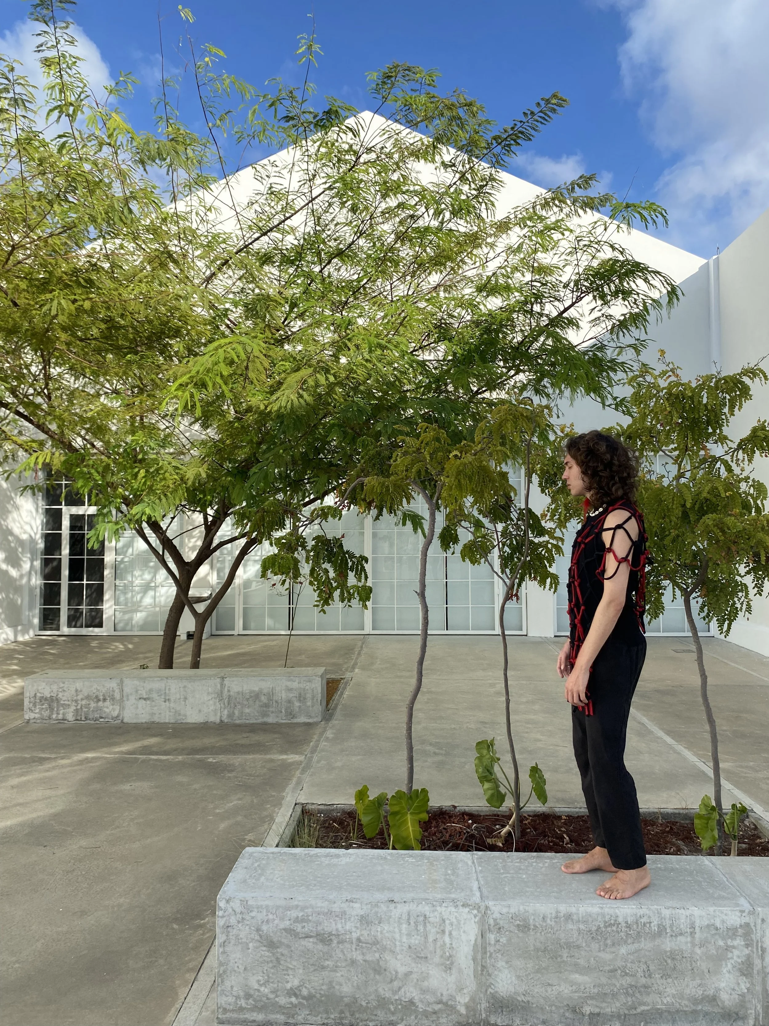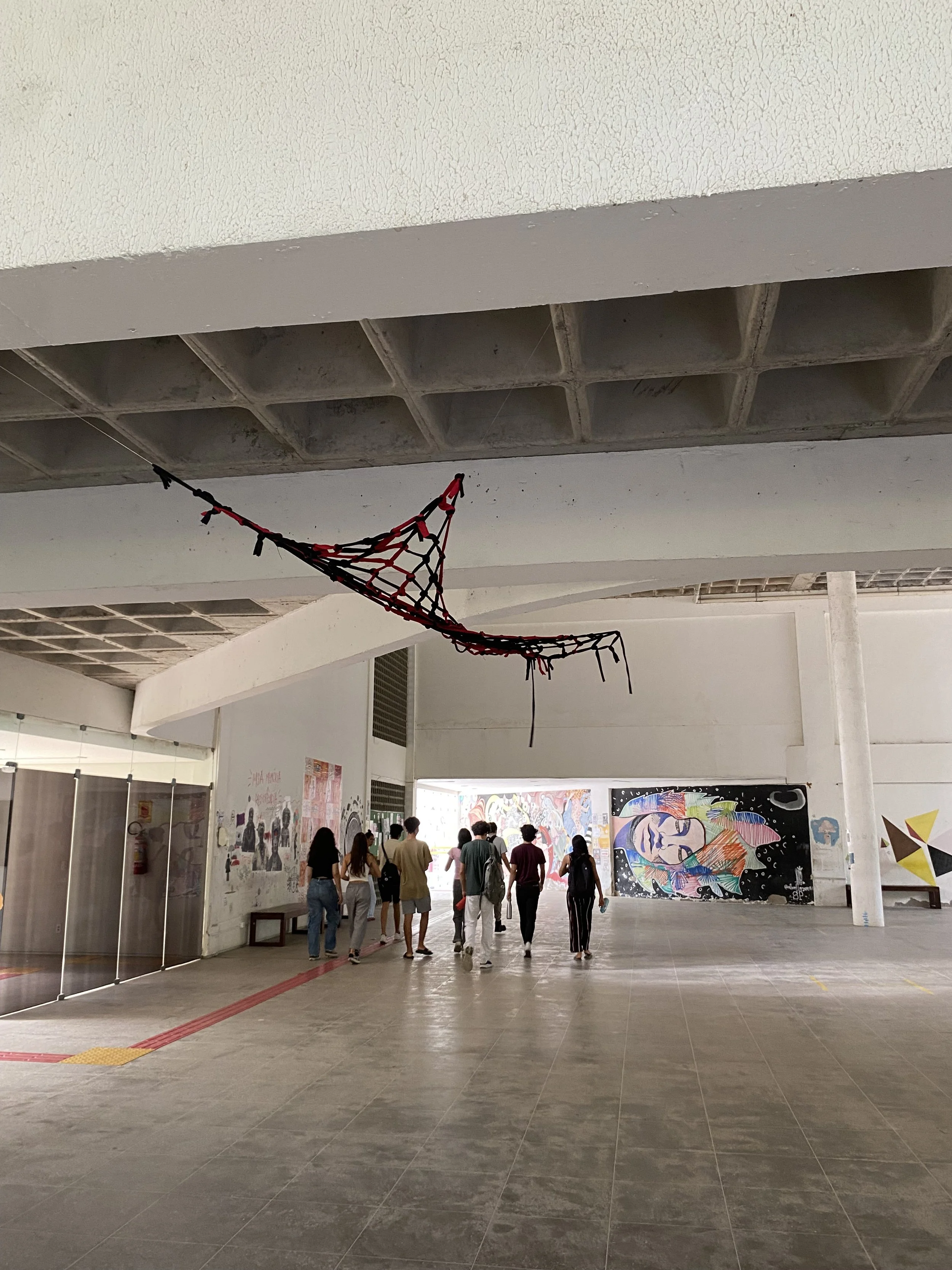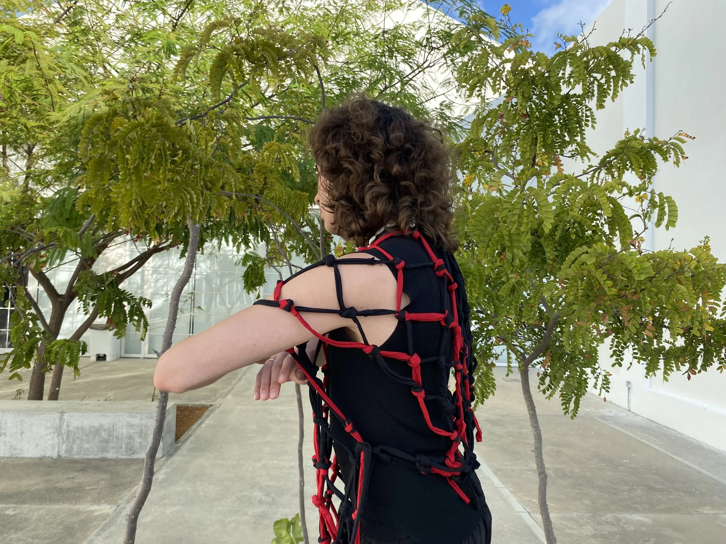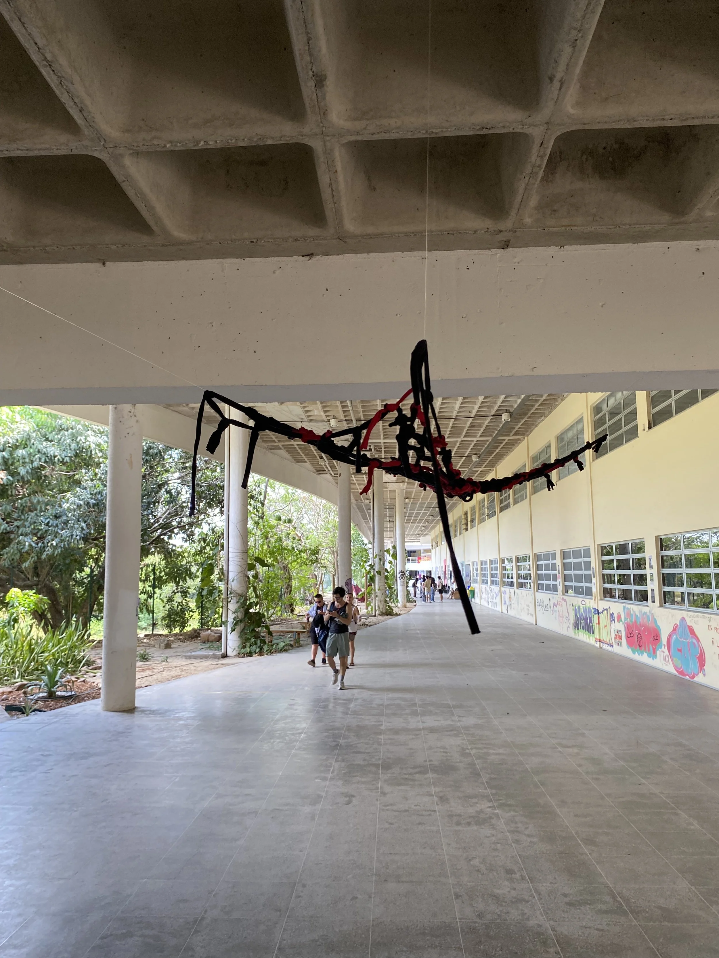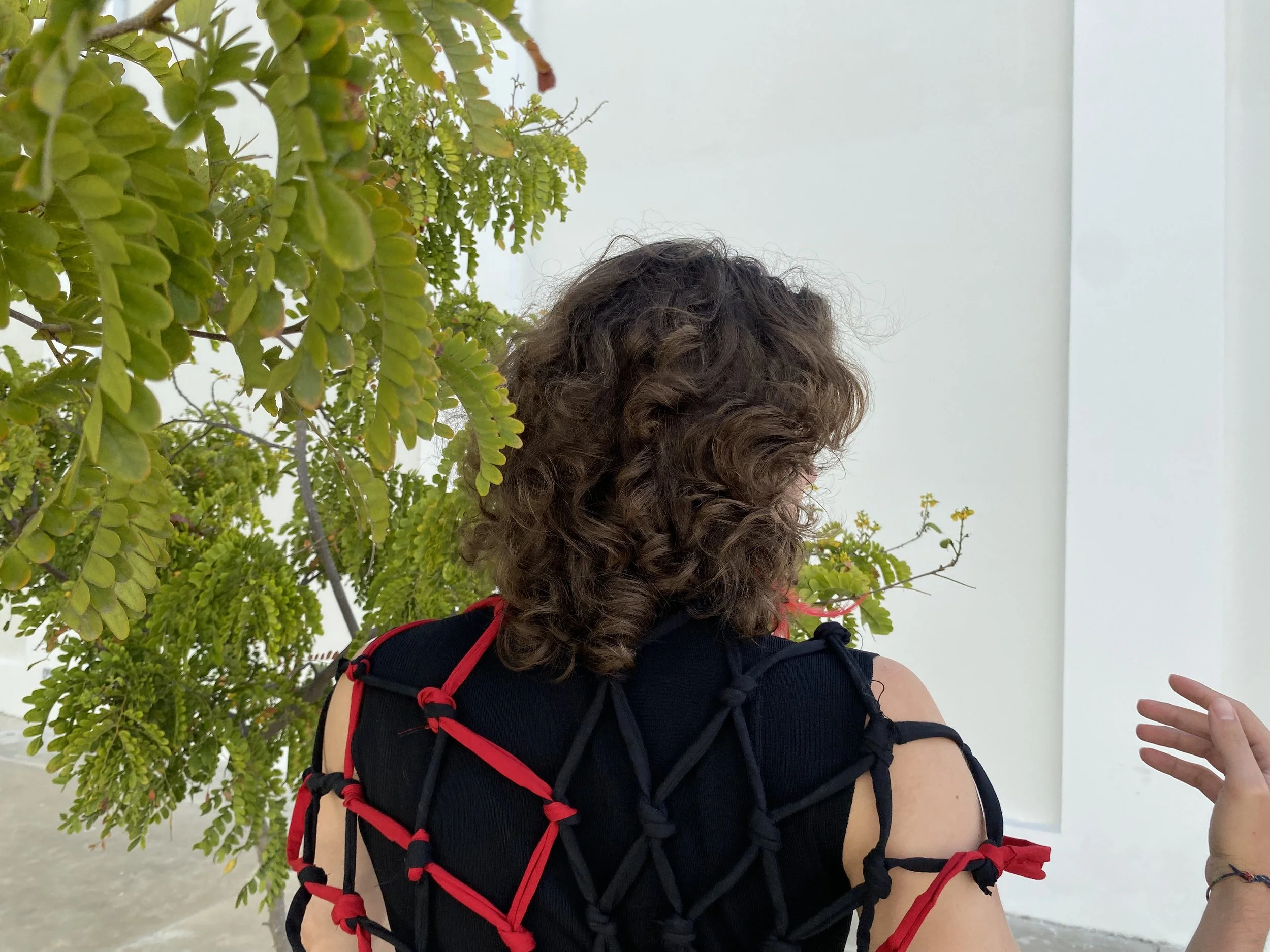 A Thread is a Path, A Knot is an Encounter is a performance installation-based work that weaves together fabric remnants from the Brazilian garment industry into a growing macramé net. Drawing on personal and collective histories of migration and queerness, the work treats the act of knotting as both a material and relational practice. Each thread carries memory; each knot marks a moment of encounter, care, or transformation. The piece unfolds as a space of connection and becoming, where waste is revalued, and alternative ways of relating to land, bodies, and one another are imagined.